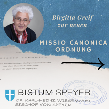 Für die Diözese Speyer wurde die Missio canonica auf dieser Grundlage neu gefasst, durch unseren Bischof Dr. Karl-Heinz Wiesemann in Kraft gesetzt und im kirchlichen AmtsblattOVB 04/2023 veröffentlicht. Die neue Ordnung fokussiert sich auf das, worum es eigentlich geht: Die Religionslehrerinnen und Religionslehrer zu stärken und in einer Gemeinschaft zu tragen. Die neue Musterordnung bedeutet eine fundamentale Weiterentwicklung. Die persönliche Lebensführung spielt keine Rolle mehr. Konkret bedeutet dies, dass Fragen der sexuellen Orientierung und der Gestaltung von Partnerschaften nicht von Belang sind. Vielmehr geht es allein um die persönliche Beheimatung und Identifikation mit dem kirchlichen Auftrag. Die Antragsunterlagen wurden dementsprechend angepasst.