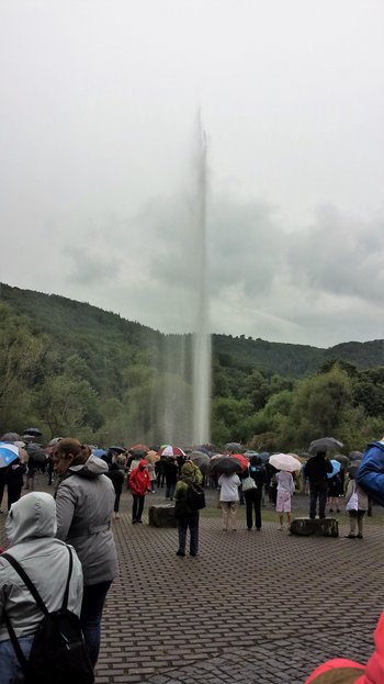 Am Dienstag fuhren wir nach Andernach. Durch den dichten Regen gings zum Geysir-Infozentrum. Das freundliche, gut geschulte Personal führte uns durch das Geysir-Museum. Wir konnten vieles ausprobieren, „begreifen“. Eine kleine Schifffahrt brachte uns dann zum Geysir. Das Wasser schoss aus der Erde. Die Luft war „mineralisch“, man konnte es schmecken und riechen. Wir waren alle fasziniert.